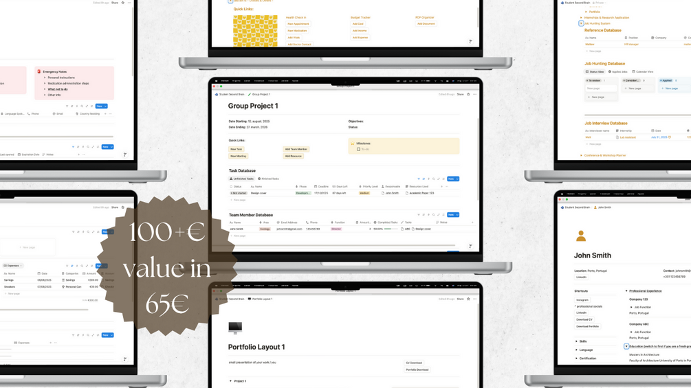 The Student Second Brain is a complete, interconnected Notion system designed to support every area of your student life β from university organization to personal development, career planning, wellness, budgeting, and beyond. Whether you're a first-year student or finishing your thesis, this is your all-in-one hub.